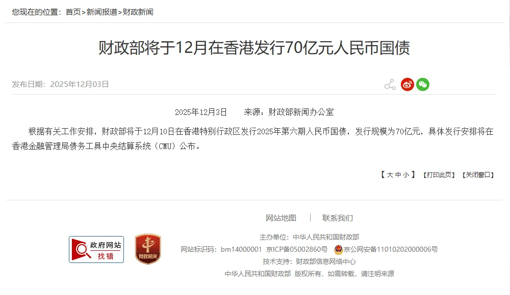 继10月15日成功发行第五期人民币国债后,财政部今日宣布,将于12月10日在香港发行2025年第六期人民币国债,发行规模共计70亿元。