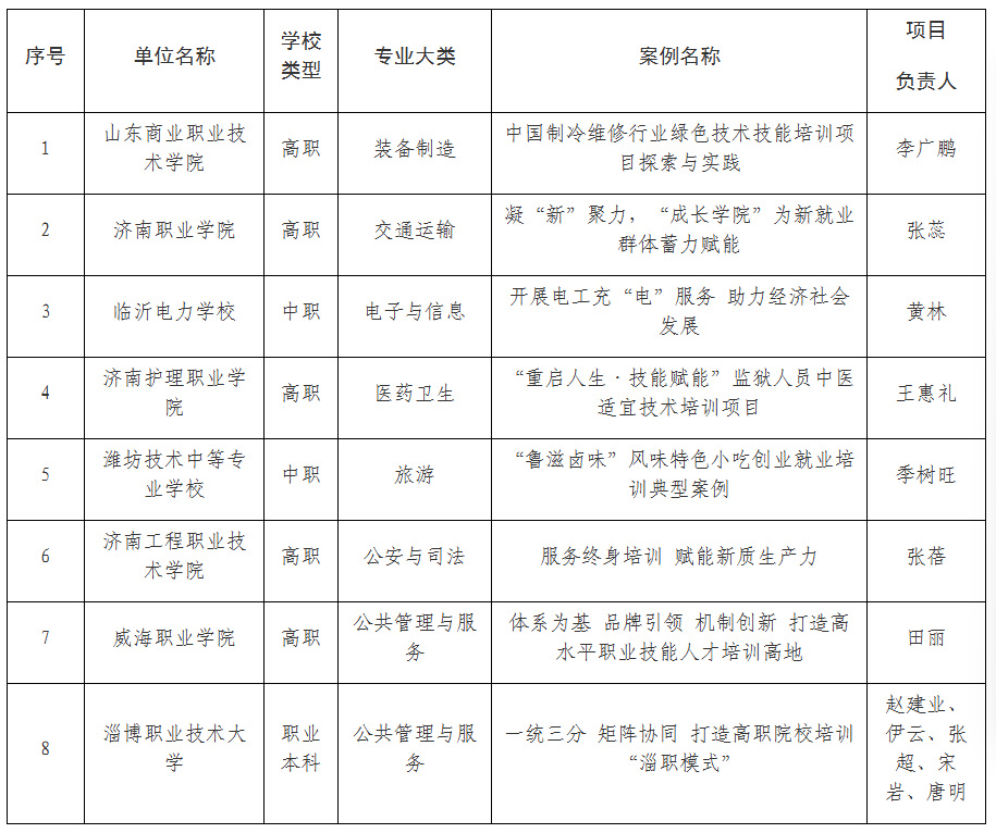 为推动职业学校高质量开展职业技能培训,助力高技能人才培养,有效促进就业创业,教育部办公厅组织征集了职业学校面向社会开展职业技能培训典型案例与优质课程,近日公布了推介名单,山东共有13个项目入选,数量居全国第2位,其中典型案例8项、优质课程5门。
