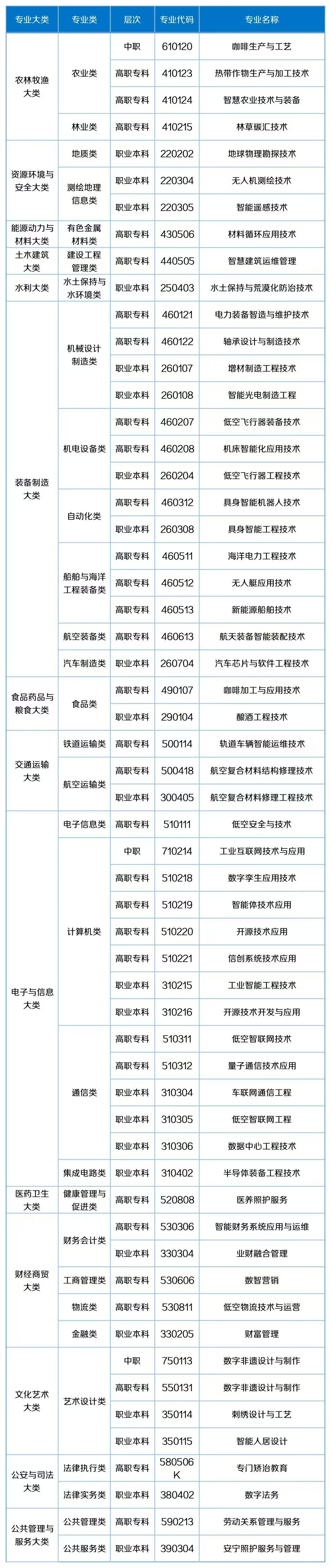 依据《国家职业教育改革实施方案》要求,原则上每5年修订1次职业院校专业目录,学校依据目录灵活自主设置专业,每年调整1次专业。2025年7月,教育部职成司发布《关于组织开展2025年职业教育专业目录增补专业论证工作的通知》,旨在围绕国家战略和区域、行业高质量发展新需求,促进专业设置与区域产业布局紧密对接,重点论证增补低空经济、人工智能、数字经济等新兴领域,新能源汽车、航空航天装备、集成电路等先进制造业,生物育种、农产品种养和加工、农业经营等现代农业,养老、托育等现代服务业重点领域相关专业。