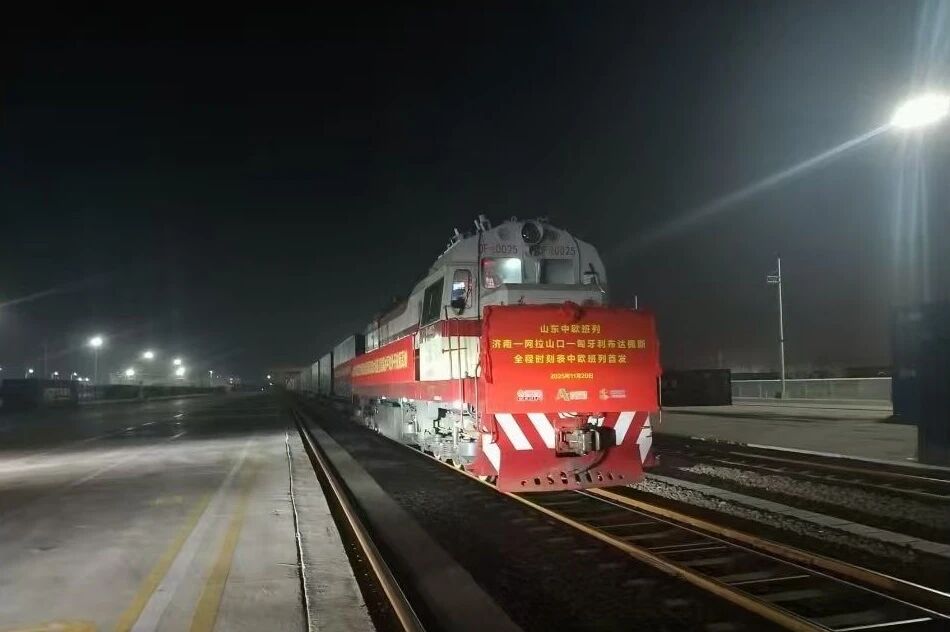 11月20日19时,X8182/1次全程时刻表班列从济南董家镇站发车,将经阿拉山口口岸出境,途经哈萨克斯坦、俄罗斯等六国,最终抵达匈牙利布达佩斯,全程运距9958公里,运输时间12天3小时。济南至匈牙利布达佩斯全程时刻表中欧班列,每双周周四始发,通过“定点、定线、定车次、定时、定价”模式,减少了普通货运“拼车发车”的影响,降低了企业仓储成本,压缩班列在途时长约30%,不仅拓展了山东对接“一带一路”沿线国家的物流网络,也让“好品山东”更快、更稳定走进欧洲市场。