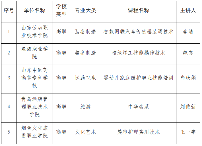 为推动职业学校高质量开展职业技能培训,助力高技能人才培养,有效促进就业创业,教育部办公厅组织征集了职业学校面向社会开展职业技能培训典型案例与优质课程,近日公布了推介名单,山东共有13个项目入选,数量居全国第2位,其中典型案例8项、优质课程5门。